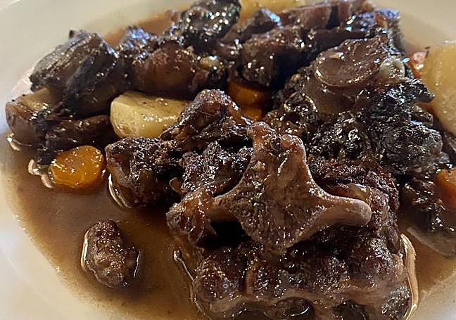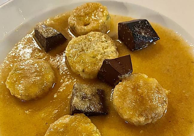 No darán crédito del viaje al pasado que supone sentarse en sus mesas, anudándose la servilleta al cuello. Al local se accede por una estrecha escalera y el panorama es el de una sencilla casa de comidas alojada en un inmueble señorial. Recuerden cuando comían de críos en casa de la tía Mari Carmen y visualizarán las carantoñas, la vajilla, la piedra vista, el olor a guiso, las vigas de madera, el olor a cera de los baúles de alcanfor, las cortinas filtrando la luz del mediodía, los manteles de algodón y esos viejos cuadros acumulados en las paredes junto a las fotografías que ilustran la biografía familiar. Son tan castas que presumen de su placa de bronce al mérito turístico y atesoran dos cocinas económicas de leña, ahí es nada. Como siempre visito las salas de máquinas de los restoranes, doy fe de que allá rugen esos dos bellezones con sus aros metálicos que los proveen de agua caliente, meciendo suavemente los sofritos que bailan en el culo de los pucheros.