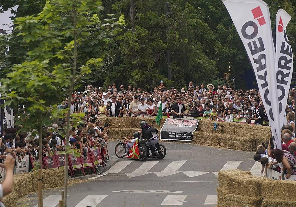 Al más puro estilo Celedón, las cuadrillas descienden desde la colina en unos originales bólidos. Un aparatoso accidente obligó a sacar la bandera rojaEste cuento, por mucho que se entregue todos los años –y ya van siete–, uno nunca se cansa de leerlo. Se sabe cómo empieza, en ... lo más alto de la cuesta de San Francisco, pero no cómo terminará: si derrapando, contra los fardos, volcado... Es más, la bandera roja tuvo que salir a escena tras un aparatoso accidente. Solo los más diestros al volante de estos 28 improvisados y originales bólidos –la cuadrilla Petralak bajó a lomos de su potra salvaje y Los Alegríos vestidos de Caperucita y el lobo– consiguen cruzar la línea de meta ubicada en la calle Olaguíbel. El Gran Premio de las goitiberas, esa otra Bajada de las fiestas organizada por Los Alegríos y con el apoyo de EL CORREO, no ha defraudado este martes. 200 metros de pura adrenalina y un temible zigzagueo que volvió a reunir a centenares de seguidores que, vermú en mano, disfrutaron del espectáculo.
