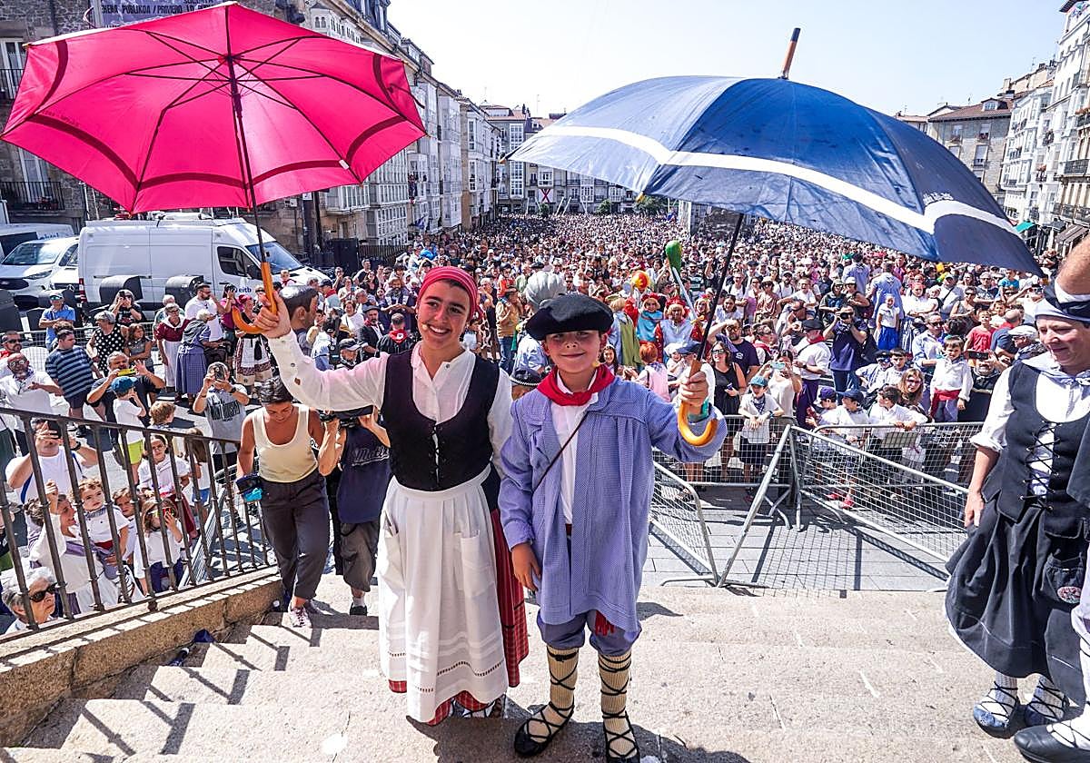 Al final, ambos han bordado el papel. Tan nerviosos como ilusionados, estos pequeños se han dado un baño de masas después de que los muñecos de Celedón y Edurne Txiki culminaran su descenso por un robusto cable de 200 metros y 50 metros de desnivel desde la torre de la Iglesia de San Miguel hasta Postas.