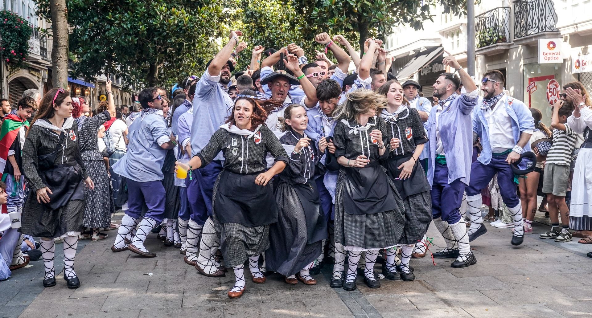 Con la música de fanfarre o txaranga traída de Majadahonda o Benicarló, por ejemplo, se ha ganado en bullicio, en jarana, en ruido en los paseíllos. El megáfono da mucho juego al hombre orquesta que viste por pantalón corto un culote histriónico, de colorines y monigotes. Entre el Tsunami show, El conejo de la Loles, Txarangutanes y demás, la fiesta está servida, solo que la escuchan los que avanzan al lado, porque aquellos blusas y neskas que marchan en cabeza, a decenas de metros, no se enteran.Tampoco bailan, claro, pasean. Lo mismo que la originalidad, perdida para siempre en la ida y en la vuelta. Nadie trasgrede.