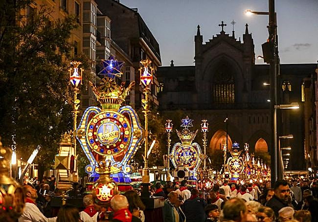 Son 126 los años ya desde que por primera vez Manuel Díaz de Arcaya y Felicia Olave, atraídos por la brillante colección zaragozana, trajeron a su ciudad una tradición farolera que, por el momento, no pierde fuelle. Con suplentes más que suficientes y una «participación masiva», de 385 cofrades y un buen puñado de txikis, se pudieron sacar prácticamente casi todas las joyas de vidrio policromado -271- en una procesión tan emotiva como solemne para reencontrar a los vitorianos con su patrona un año después.