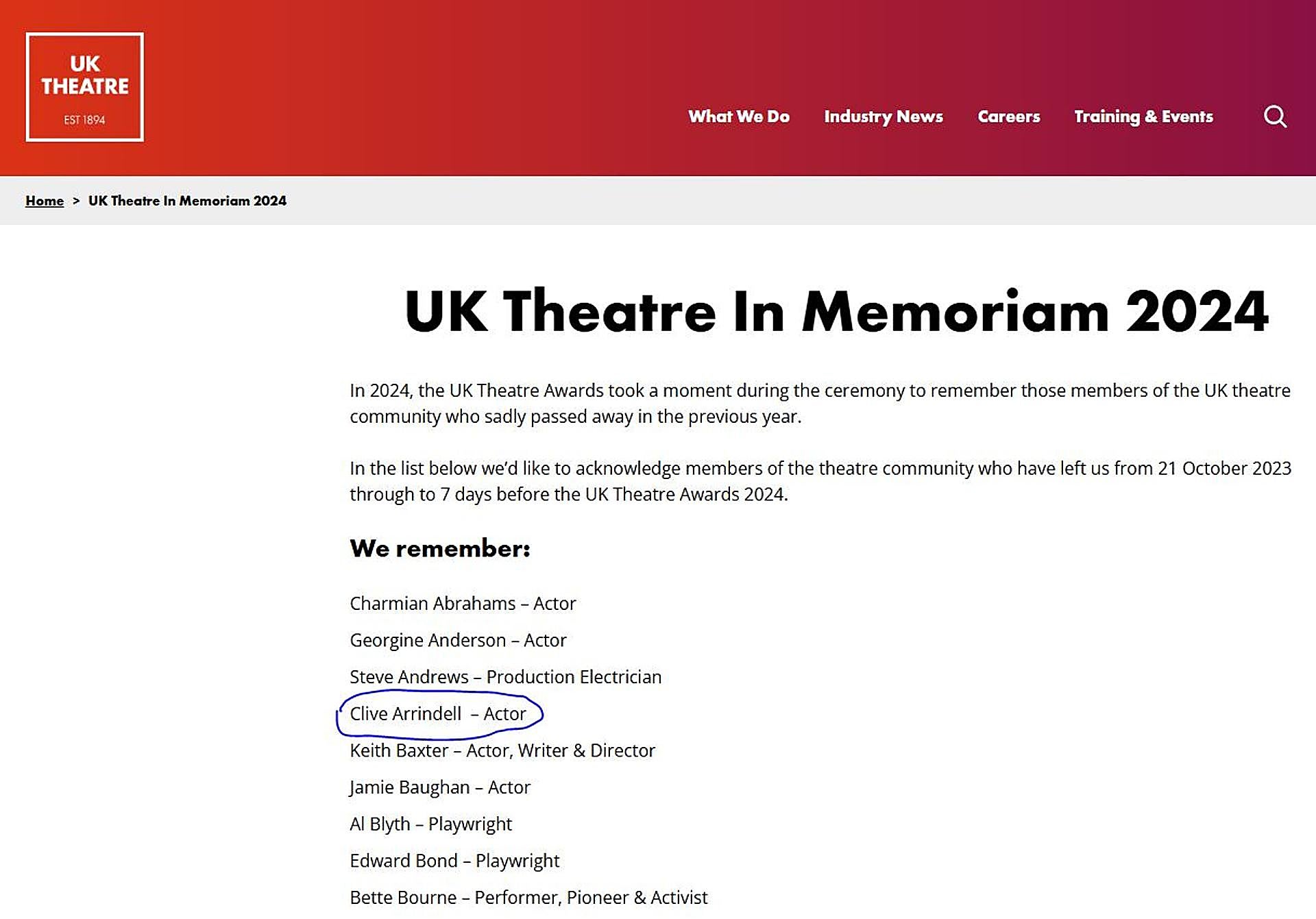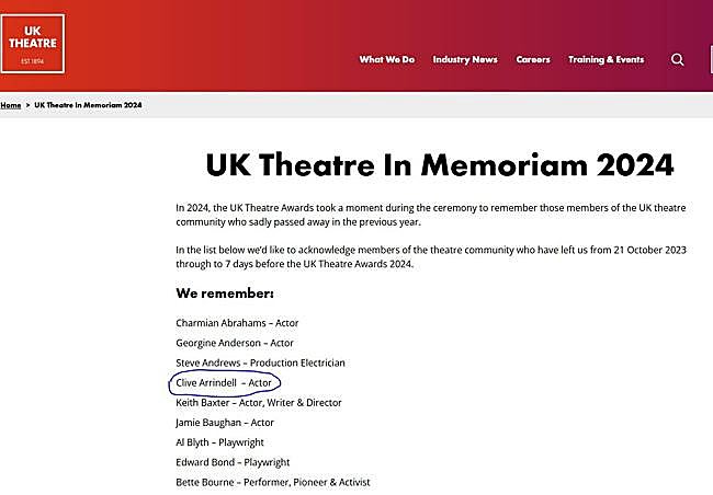 Su muerte ha pasado completamente desapercibida en los medios españoles hasta ahora. Es la web oficial de UK Theatre, la organización que representa a los teatros y las artes escénicas en todo el Reino Unido, la que confirma la noticia. El nombre de Clive Arrindel aparece entre los recordados In Memoriam en la ceremonia de 2024. También el Old Augustinians College, centro donde estudió Arrindell, incluyó su nombre en la misa anual de conmemoración celebrada el 9 de noviembre de 2024 en Ramsgate, Inglaterra.
