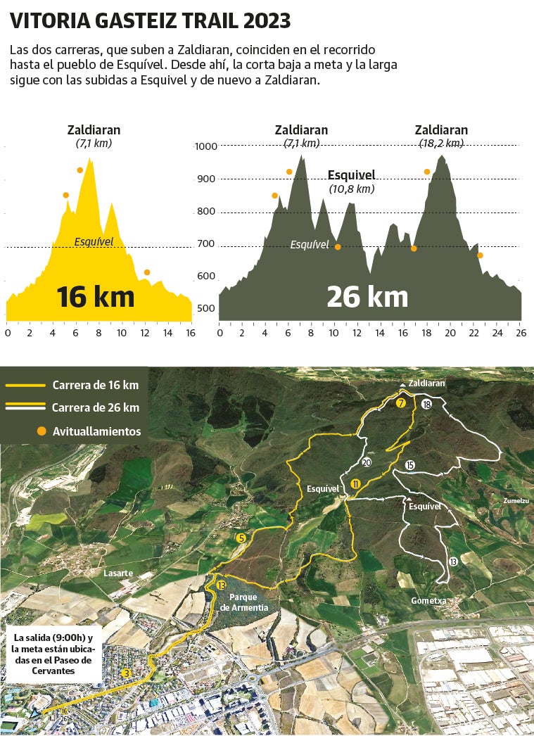 La prueba plantea dos recorridos: uno de 16 kilómetros y otro de 26. Ambos partirán a las 9.00 del Paseo de Cervantes para, en cuestión de minutos, adentrarse en el bosque de Armentia y ascender al Zaldiaran. La distancia larga hace también cumbre en otra cima mítica de la provincia, Esquível. Un recorrido con un desnivel positivo de 600 metros en la primera categoría y 1.260 en la segunda que, sin embargo, es un buen desafío para novatos. «Las pruebas son tan duras como uno las quiera hacer. Pero a priori es una carrera para todos los públicos, incluso gente que se quiera iniciar y no meterse en un berenjenal. Son distancias, entre comillas, asequibles para todo tipo de público», valora García Castán. Sabe de lo que habla. Cinco veces campeón de España de trail -denominación frecuente de las carreras de montaña-, ganó en 2009 el Europeo y fue uno de los primeros exponentes de la disciplina a nivel nacional. Aunque sus inicios fueran casi por casualidad. «Corría por la montaña antes de saber que existían las carreras de montaña. En mi pueblo, La Granja de San Ildefonso, estamos rodeados de montañas. Como soy muy activo siempre iba corriendo», evoca. «Un día un amigo me dijo que su hermano organizaba una carrera. Era una cosa que no había oído nunca. Y sin haber corrido nunca específicamente para ello quedé tercero. Eso me animó mucho», añade.