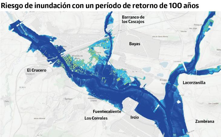 También permite conocer el número de ciudadanos que resultarían afectados por ese tipo de fenómenos meteorológicos. En términos humanos, en Miranda, la crecida con un periodo de retorno de cien años obligaría a evacuar a 21.799 personas, un 61,5% de la población. Porcentaje que se reduciría a un tercio, con 10.177 habitantes desplazados, en el caso de una crecida de las de una cada 10 años. En el otro extremo, la de mayor impacto, en la de una inundación de las que hay una cada cinco siglos, obligaría a mover a 26.704 vecinos.