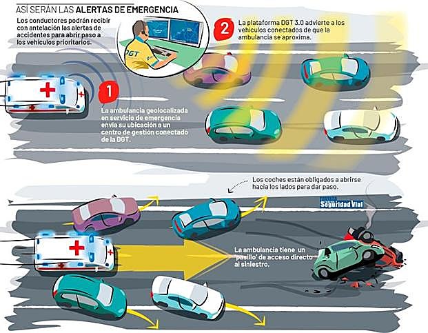Esto será posible porque ambulancias, coches de bomberos y policías circulan geolocalizados y transmiten su situación a los centros de gestión correspondientes. A partir del año próximo, estos centros podrán compartir esta información en tiempo real con la plataforma DGT 3.0, que hará llegar la alerta a los vehículos que circulen cerca del punto conflictivo de la vía donde hay un accidente o cualquier otro tipo de incidencia.