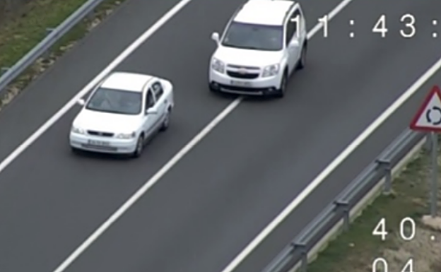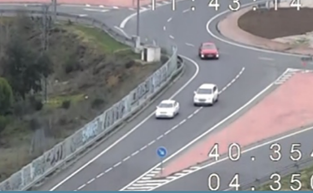2- El segundo turismo blanco continúa circulando a caballo entre dos carriles, sin duda tratando de adelantar al que le precede, pero sin la suficiente velocidad como para realizar la maniobra en este tramo de dos carriles que se van estrechando hasta convertirse en uno solo. Quizás por ello, se conforma y se pone a circular tras dicho vehículo.