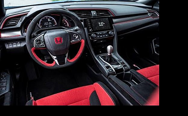 El volante recubierto con Alcantara mejora el agarre, mientras que el pomo de la palanca de cambios con forma de lágrima recuerda al de los modelos Type R anteriores. El pomo de la palanca de cambios incorpora un contrapeso interno de 90 g para mejorar el tacto y la precisión en los cambios. La inserción central de carbono del panel del salpicadero está rodeada por una moldura de rayas (que se extiende hasta los paneles de las puertas) para dotar al Type R de un estilo deportivo exclusivo e inconfundible.