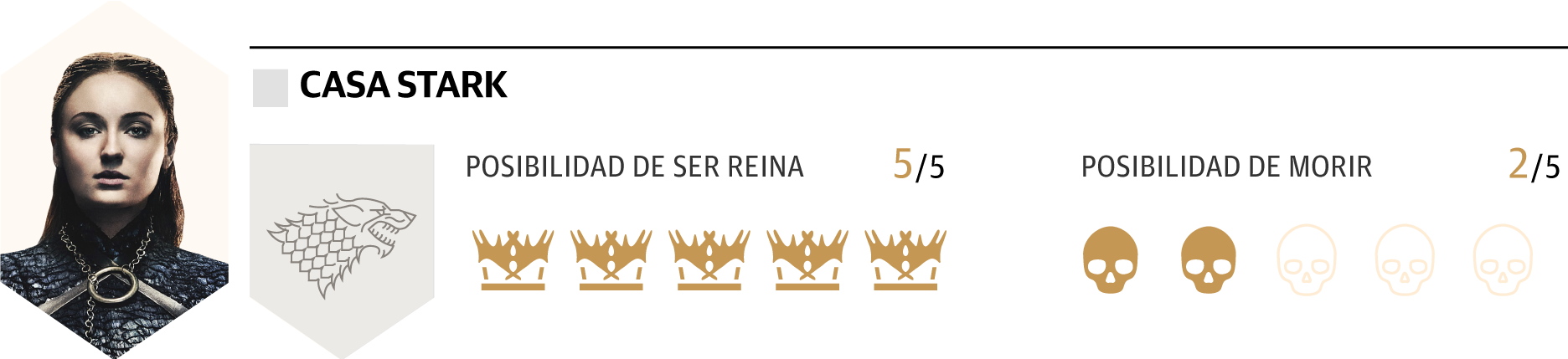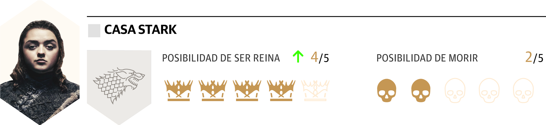 5. Cuenta entre sus armas con su hermana Arya, que se ha revelado como una valiosa guerrera y que bien podría ser su mano en un posible reinado. Puede ayudarle a acabar con Khaleesi.