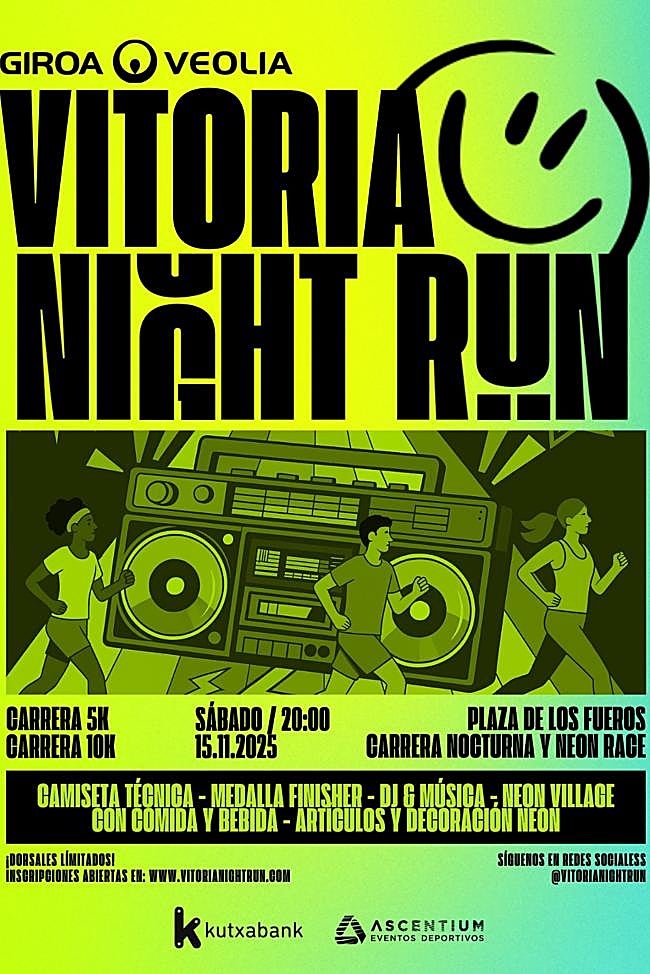 Corre, baila, disfruta. Este es el 'leitmotiv' de la Vitoria Night Run. Se trata de una carrera y fiesta nocturna, toda «una experiencia más allá del deporte», que celebra su primera edición en la capital alavesa. Esta iniciativa ha tenido una gran acogida, ya que todas las inscripciones para los dos recorridos -de 5 y 10 kilómetros- están agotadas. Los vitorianos podrán ver a los 'runners' corriendo de noche por el centro de la ciudad bajo los focos, con pintura neón.