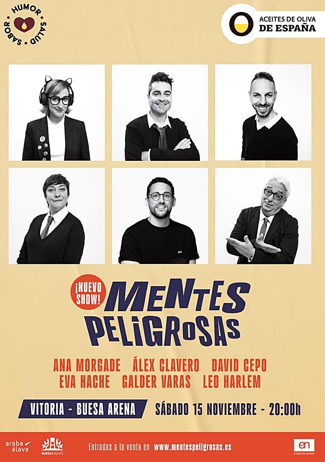 Tras vender más de 70.000 entradas en su primer año de vida, 'Mentes peligrosas afronta un nuevo curso con la ilusión de repetir su éxito. Eso sí, con un espectáculo completamente renovado. Varias de las figuras de la comedia nacional aterrizan este sábado en Vitoria para brindar un nuevo 'show', nuevos monólogos y gags. Ana Morgade, Álex Clavero, David Cepo, Eva Hache, Galder Varas y Leo Harlem llegan al Fernando Buesa Arena para bailar, cenar, beber… Y, sobre todo, para reírse y hacer reír como nunca. Mentes brillantes, talentosas y peligrosas que se reúnen una vez más para crear «una experiencia única».