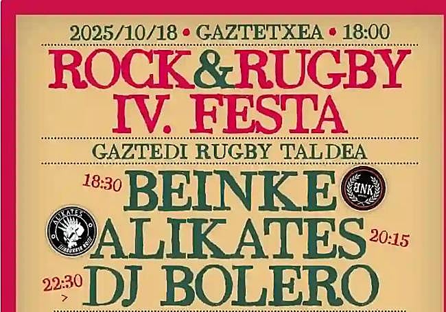 Cuarta edición de la Rock&Rugby Festa del Gaztedi, donde música y deporte se dan la mano. Con los conciertos de Beinke (18:30) y Alikates (20:15) y el broche final del DJ Bolero. No faltarán el merchandising del equipo, sorteos, el pintxopote... Y mucha marcha.