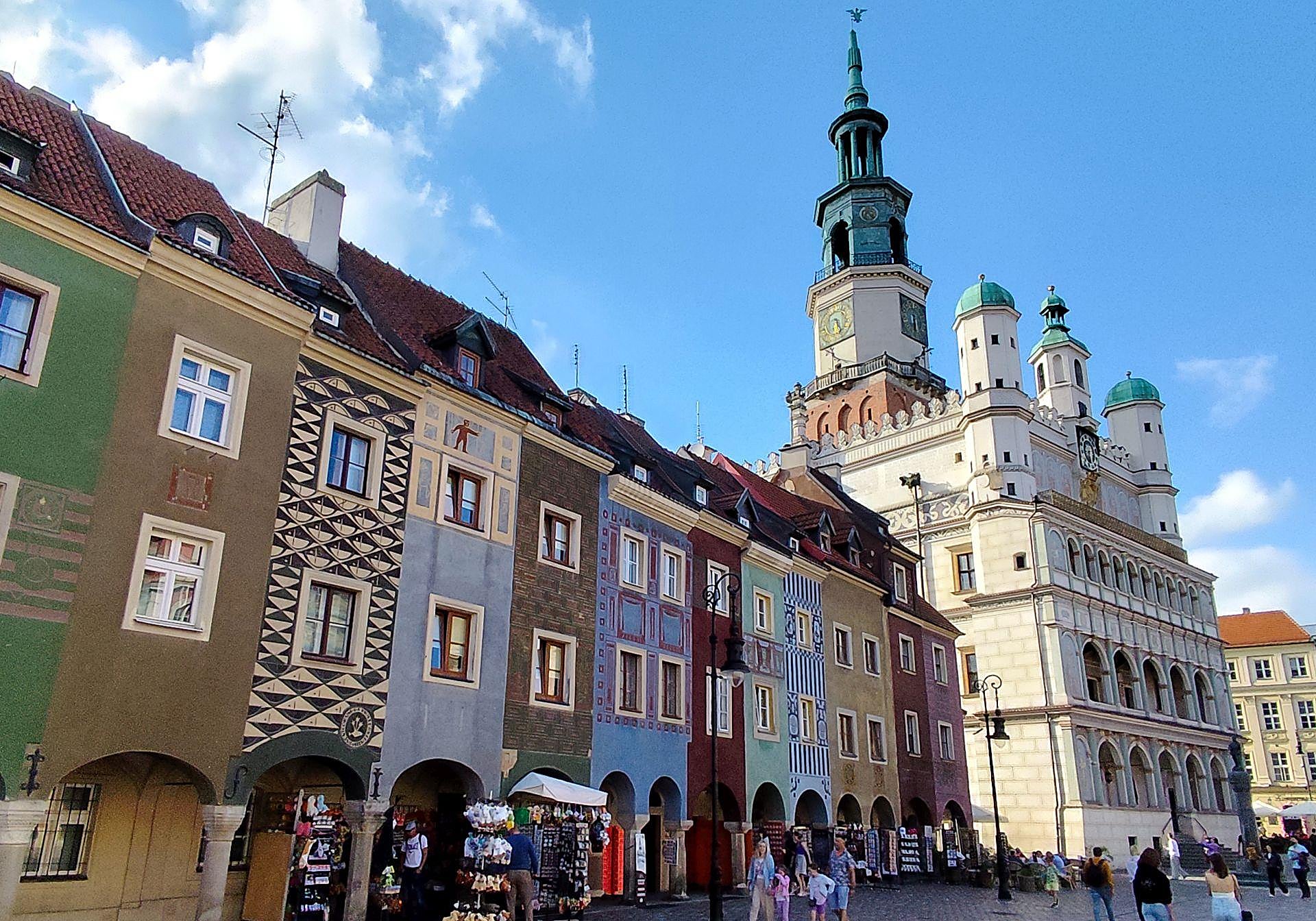 Elegir una ciudad favorita en Polonia es como decidir si quieres más a papá o a mamá, cada una tiene su encanto y quien visita ese país no sabe con cuál quedarse. Una de las que hacen dudar y comprometen a quienes no desean implicación ante la duda es Poznań. Capital de Polonia Mayor, luce modernidad, un estilo distintivo y calles repletas de jóvenes. El turista se rinde al enamoramiento a primera vista nada más acceder a la Plaza del Mercado, y ese amor permanecerá por siempre en lo más hondo de la memoria. Imposible no emocionarse ante las casitas de colores elegantemente decoradas. Triángulos, rectángulos, círculos y líneas provocan chibiritas geométricas en los ojos cuando se posan en los antiguos edificios burgueses y puestos de venta pegados al ayuntamiento de estilo renacentista italiano, uno rojo y otro violeta, uno granate y otro azul, el siguiente verde, después el amarillo, al final el rosa. Todos rodeados por un corro de preciosos inmuebles cuyas fachadas ponen rostro distinto a cada cuerpo levantado hacia el cielo.