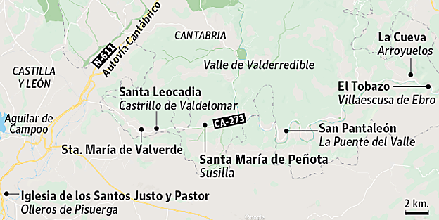 No es mala idea quedarse en la parte oeste, en el núcleo que forman las de los pueblos apellidados 'de Valdelomar', con Santa María de Valverde y el Centro de Interpretación del Rupestre como punto de partida. Sobre todo porque si se continúa yendo hacia el Occidente, se cruza a Palencia, se pasa Aguilar de Campoo y se planta uno en Villacibio, donde merece la pena conocer San Pelayo, y en Olleros de Pisuerga. Y aquí presumen los vecinos de la iglesia de los Santos Justo y Pastor y dicen que no hay nada igual en toda la Península ni más allá –algo en Francia, pero bah, cuentan–. Puede ser.