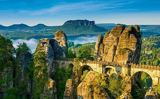 Este mirador se sitúa sobre el río Elba, cerca de Dresde en el estado de Sajonia, un bastión que se ha formado por la erosión del terreno durante miles de años. A una altura de 200 metros aproximadamente sobre el nivel del agua, se levanta un puente que une varias de las rocas más grandes de este lugar y desde el que se puede disfrutar de una espectacular panorámica sobre la campiña alemana, un horizonte infinito de pueblos alemanes, castillos medievales y ríos de cuento de hadas.