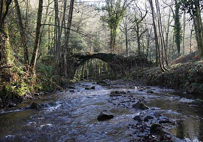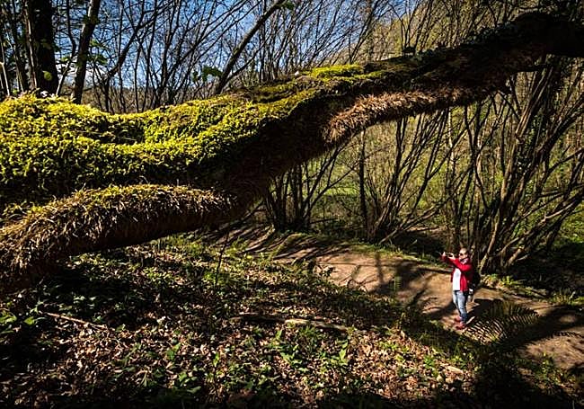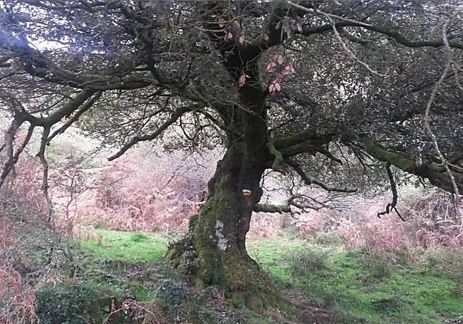 Más adelante dejamos la pista de grava y tomamos un ancho camino (izd.) entre helechos. Tras rebasar un depósito de aguas, una trocha (izd.) nos adentra en el bosque encantado, donde conviene no perder de vista las señales blancas y amarillas. La parte alta del encinar es la más intrincada. El camino discurre entre rocas cubiertas de musgo, encinas retorcidas que forman fantasmagóricas figuras y castaños centenarios. Un escenario que nos traslada a mundos oníricos.