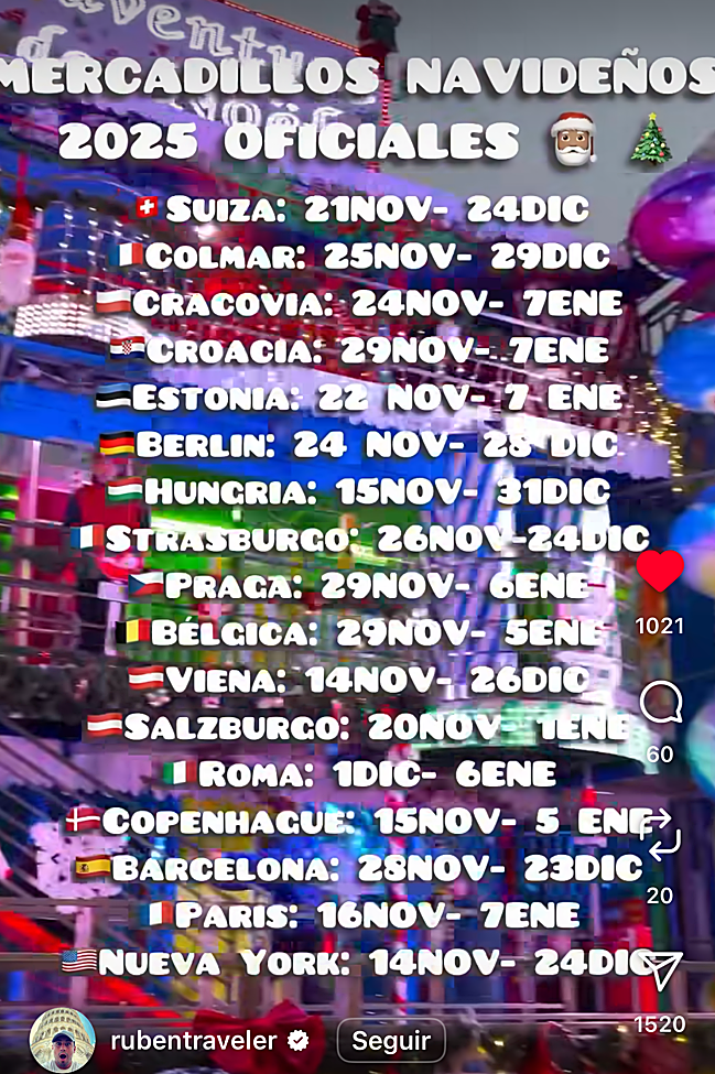 Durante estas últimas semanas, en redes sociales como TikTok o Instagram, numerosas cuentas comparten contenido sobre los mejores mercadillos de Navidad en el Viejo Continente. Los principales ya tienen fecha oficial de inicio y son las siguientes: