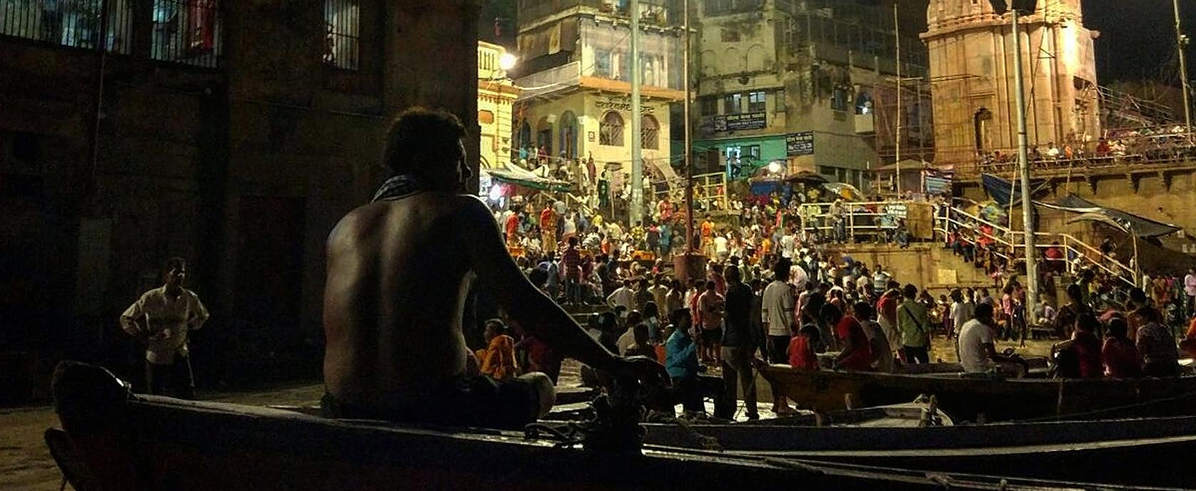 Las barcas empiezan a zarpar de los embarcaderos, los que van andando caminan por las callejuelas hasta llegar a las escalinatas del 'ghat' en el que se celebra la ceremonia. Ya no hay sol. Solo la luna y el fuego iluminan la noche. En tierra, entre la multitud de personas, cinco brahmanes encima de un altar presiden la ceremonia. En el mar, fieles y turistas se agolpan en la orilla. Huele a vela, a incienso. Los hinduistas hacen sus ofrendas, las lanzan al río y repiten los mantras.