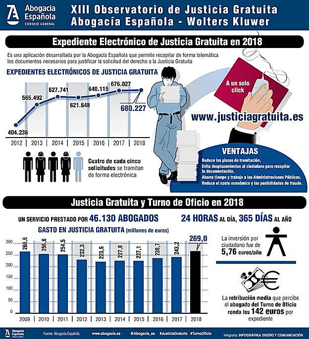 La inversión pública alcanzó los 269 millones de euros en 2018, un 10% más, y 46.000 abogados del turno de oficio recibieron 142 euros de media por expediente