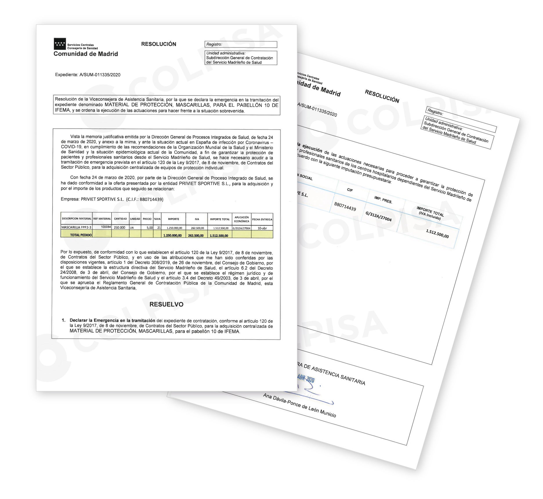Son apenas dos páginas pero han provocado todo un terremoto político. El contrato por el que el PP supuestamente pretendía investigar al hermano de Ayuso se adjudicó sin concurso público y por «trámite de emergencia». La Comunidad de Madrid, el 1 de abril de 2020, en pleno estado de alarma por la crisis sanitaria de covid y en una situación de desabastecimiento mundial de mascarillas, compró 250.000 tapabocas FFP2 y FFP3 a la empresa Priviet Sportive SL.