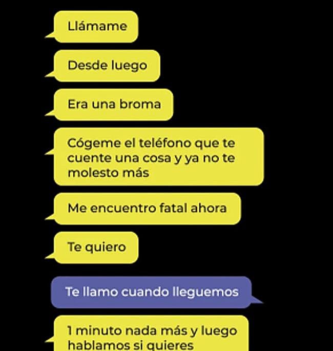 En otro momento, según los mensajes incluidos en la documentación aportada, Navarro se muestra decepcionado por la reacción de ella: «Anda. Llámame. Desde luego… Era una broma. Ya te vale. Cógeme el teléfono, que te cuente una cosa y ya no te molesto más. Que me encuentro fatal ahora. Te quiero». Ella intenta salir del paso: «Te llamo cuando lleguemos». Él insiste: «Un minuto nada más y luego hablamos si quieres». La denunciante se explica: «No quiero hablar en el tren, salvo que sea una urgencia, que no creo». Él no acepta la negativa: «¿Pero por qué no quieres hablar? No lo entiendo. Llámame, hazme el favor. Ponte los airpods. ¿Tú sabes que quiero lo mejor para ti?».
