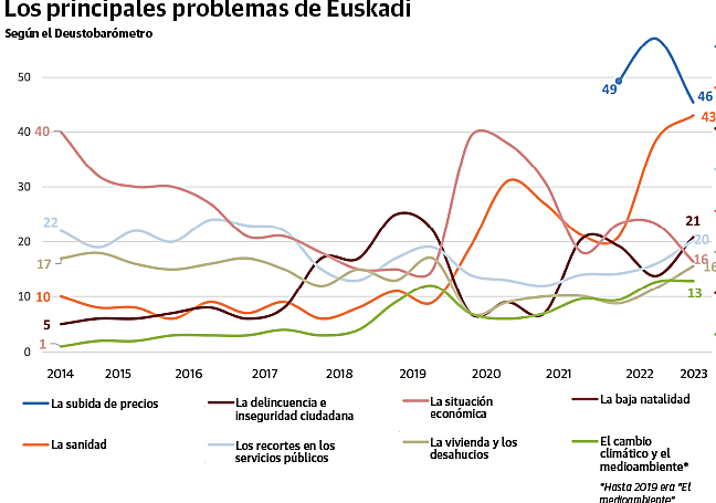 Los datos demuestran que mejora la visión sobre la situación económica que tienen los vascos. Hace seis meses la preocupación por el coste de la vida y la inflación se disparaba al 57% y ahora baja al 46%.También pasa del 23% al 16% la inquietud por la situación económica, que para el 43% de los consultados es buena o muy buena, el dato más alto desde finales desde 2019, justo antes de que estallase la pandemia por covid. Sube, eso sí, la zozobra por la situación de la vivienda y el recorte de los servicios públicos.
