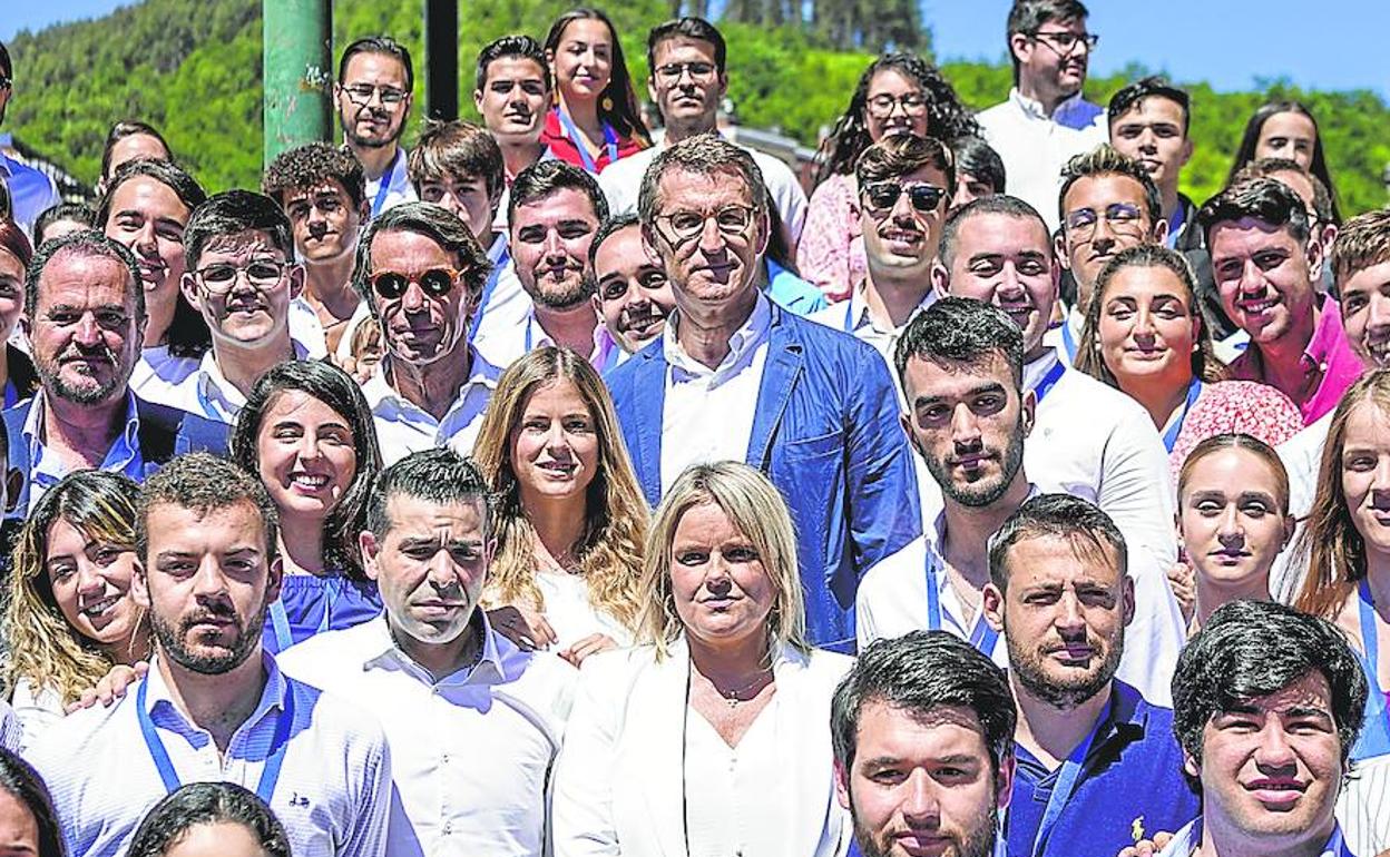 El otro vector de su intervención, en presencia de José María Aznar -a quien agradeció que encarnase «la resistencia de una sociedad que no se arrodilló jamás»- fue, de hecho, la defensa y desagravio de la Transición. Feijóo apeló a «aquel PSOE» que estaba junto a los populares cuando el terrorismo asesinaba a concejales de ambos partidos. También al socialismo de los años que sucedieron a la muerte de Franco. «Reivindico la Transición y todos los padres de la Transición. Reivindico al PSOE que la hizo posible y al resto de fuerzas que participaron en un proceso ejemplar, a todos los gobiernos y parlamentos que la protegieron a los largo de estas décadas», proclamó frente a los doscientos jóvenes de Nuevas Generaciones que acudieron al acto encabezados por su presidenta, Bea Fanjul, y la plana mayor del partido: la secretaria general, Cuca Gamarra; el 'número tres', Elías Bendodo; y el vicesecretario institucional, Esteban González Pons.