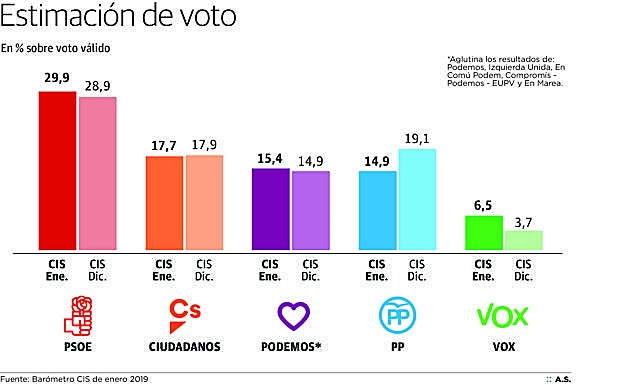 De acuerdo al barómetro, los socialistas ganan 1,1 puntos respecto a la encuesta de diciembre de 2018, mientras que los populares experimentan un fuerte retroceso de 4,2 puntos. El partido que lidera Albert Rivera también pierde dos décimas en intención de voto pese a escalar hasta la segunda posición. La formación que encabeza Pablo Iglesias sube medio punto, en tanto que el partido que capitanea Santiago Abascal incrementa en casi tres puntos su intención de voto.