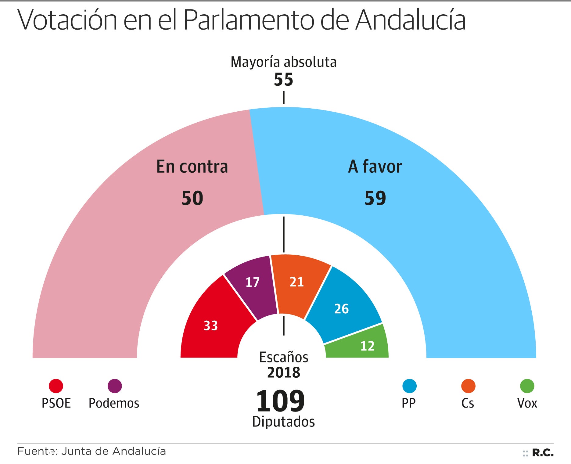 El popular Juan Manuel Moreno Bonilla se convirtió este miércoles tarde en el primer presidente de la Junta de Andalucía en casi 37 años que no procede del PSOE, gracias al apoyo de los 59 diputados que suman su propia formación, Ciudadanos y Vox, la otra gran novedad de la XI legislatura andaluza.