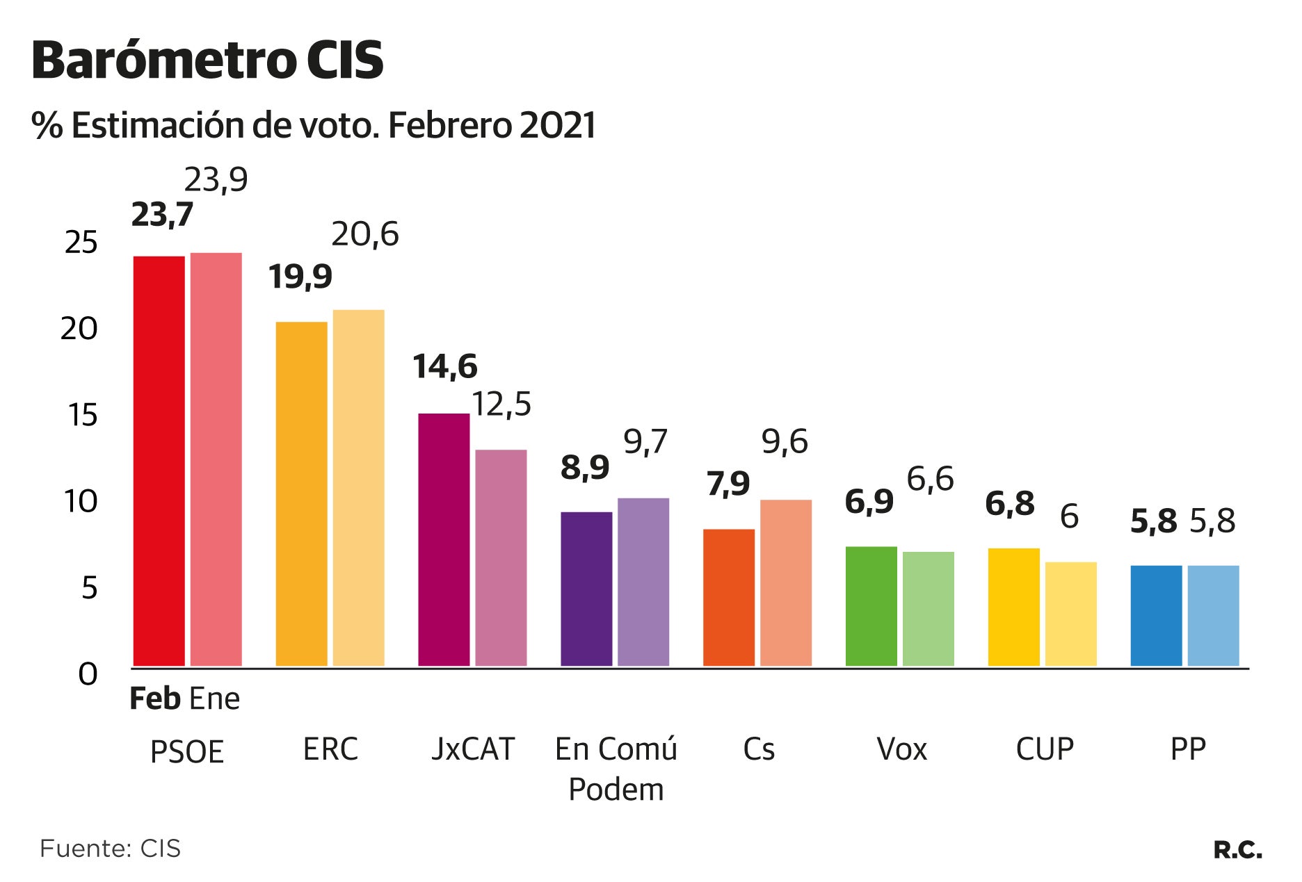El PSC obtendría una rotunda victoria en las elecciones catalanas y aventajaría a Esquerra en casi cuatro puntos y en nueve a JxCat. Esta es la fotografía de la «encuesta flash» que ha presentado hoy el CIS a diez días de las votaciones. Los socialistas sumarían el 23,7% de las papeletas; ERC, el 19,9; JxCat, 14,6; En Comú Podem, 8,9; Ciudadanos, 7,9; Vox, 6,9; la CUP, 6,8; y el PP, 5,8%.
