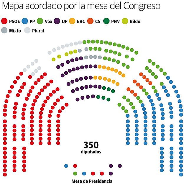 Encima de la confluencia que lidera Pablo Iglesias estarán ubicados los parlamentarios de EH Bildu, del Grupo Mixto y el recién creado Grupo Plural, que ha ido directamente al gallinero con Vox. El PSOE y el PP han sido emplazados en sus lugares habituales. Socialistas a la izquierda y populares a la derecha.