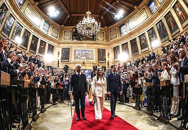 También una especial predilección por el blanco pese a que la mañana fue más propia de un sábado invernal. Aún así, el outfit de la mujer del lehendakari entrante, la del saliente, la presidenta del Parlamento, las de las Juntas Generales de Bizkaia y Gipuzkoa y la secretaria general del PSE alavés era de ese color. Las nubes respetaron el juramento pese a pasarse descargando agua toda la mañana. A la alfombra roja por la que desfilaron las autoridades solo se le quitó el plástico protector los minutos justos.