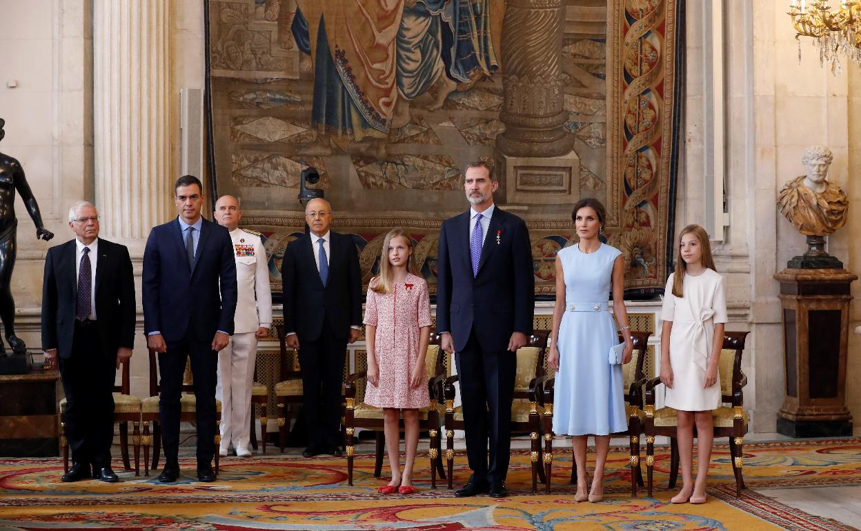 El monarca acompañado de doña Letizia, de sus hijas y del presidente del Gobierno esta mañana en el Palacio Real. Efe