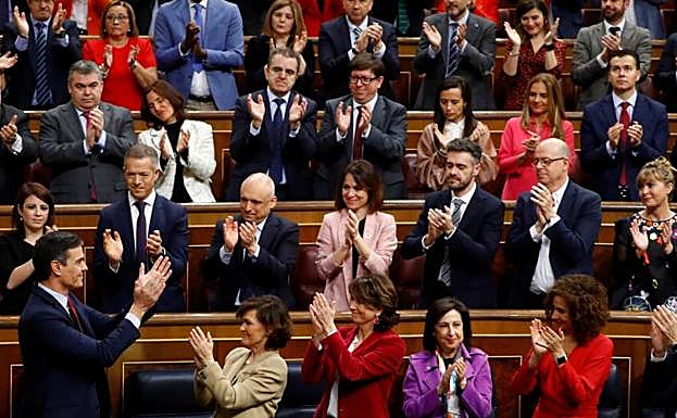 Pedro Sánchez recibe los aplausos de PSOE y Podemos tras ser elegido. Afp