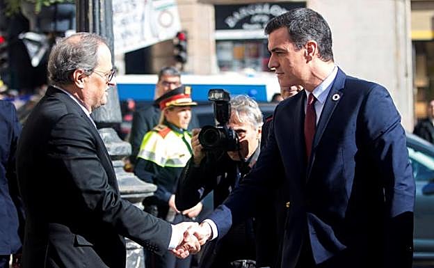 Pedro Sánchez salió este jueves satisfecho, casi ufano, de su cita con Quim Torra en el Palau de la Generalitat. «Hoy es el día en el que, a juicio del Gobierno de España -proclamó-, tiene que comenzar el diálogo para el reencuentro». Los prolegómenos de la reunión no resultaban del todo alentadores. En los últimos días, el presidente catalán había dejado claro que mantendría alto el listón de sus exigencias -derecho de autodeterminación y amnistía para los condenados del 'procés'- y en Esquerra Republicana de Catalunya llegaron a temer que aprovechara la ocasión para reventar la mesa de negociación que ellos pactaron a cambio de la investidura del líder socialista. Creían que podía tratar de dejarlos en evidencia ante un electorado por el que ambos compiten. Pero no fue así.