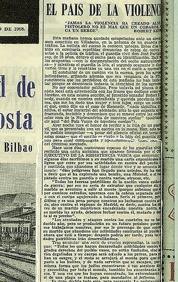 «Señora (...), todas las fuerzas de la nación vasca están en pie de guerra; por eso no sería de extrañar que cualquier día que su marido se aventure a salir al monte (porque sabemos que va por caminos extraños) aparezca con la cabeza separada del tronco o con el cuerpo agujereado a balazos. Sería el primero, pero no el único. Y es una pena». Este extracto forma parte de una de las cartas que el autodenominado Comité Ejecutivo de la Resistencia Vasca -escisión de ETA que historiadores atribuyen a la facción de 'Los Cabras'- envió en 1968 a las mujeres de los agentes del instituto armado destinados en Euskadi. El objetivo: que «convencieran» a sus maridos de que dejaran el Cuerpo o se marcharan del País Vasco.