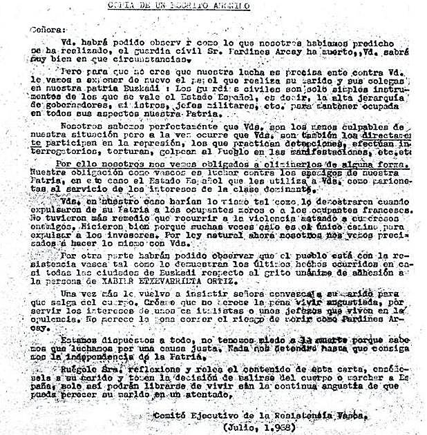 Las segundas cartas arribaron en julio a los cuarteles de Mungia, Lekeitio y Ondarroa -no se descarta que se remitieran también a otros-. «Nosotros sabemos perfectamente que ustedes son los menos culpables de nuestra situación, pero a la vez ocurre que ustedes son también los que directamente participan en la represión; los que practican detenciones, efectúan interrogatorios, torturan, golpean al pueblo en las manifestaciones, etcétera. Por ello, nosotros nos vemos obligados a eliminarlos de alguna forma», mantenía el Comité de la Resistencia Vasca. «Ustedes harían lo mismo, como lo demostraron cuando expulsaron de su patria a los moros o a los ocupantes franceses. No tuvieron más remedio que recurrir a la violencia, matando a numerosos enemigos», proseguían en sus escritos.