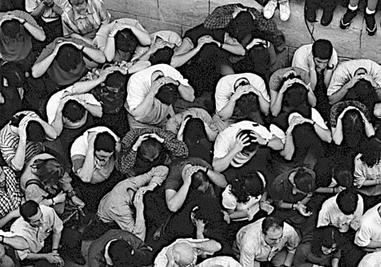 Son los momentos de la desolación mayúscula en Ermua tras el asesinato de Miguel Ángel Blanco. «Estábamos esperando la llegada de los restos mortales y yo estaba en el balcón del Ayuntamiento de Ermua. Era un momento de gran emotividad. La gente se arrodilló, puso sus manos en la nuca y comenzó a gritar: 'ETA, escucha, aquí tienes mi nuca'. Y ahí es cuando tomé esa imagen», recuerda Fidel Raso.