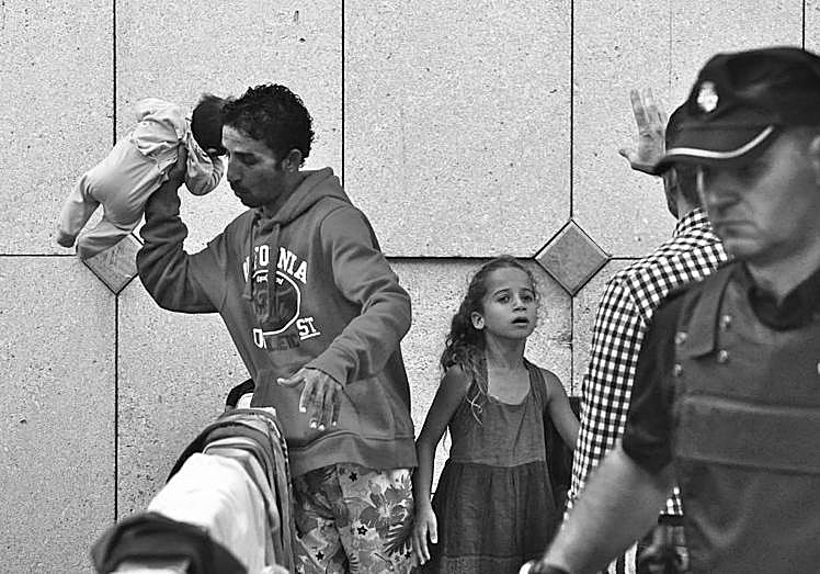 Esta foto de un padre sirio con su bebé, al que amenaza con lanzar al suelo en una rampa de garaje, tiene una gran dureza. Los policías que estaban cerca lo evitaron y el propio fotógrafo, Fidel Raso, dejó la cámara al ver lo que estaba sucediendo. Eran inmigrantes llegados de África, engañados por las mafias con la promesa de llevarles hasta la Península pero que fueron abandonados en Ceuta. Algunos menores estaban enfermos y las autoridades querían llevarles a un centro de acogida temporal. Muchos padres se negaban. Ganó con ella un segundo premio nacional.