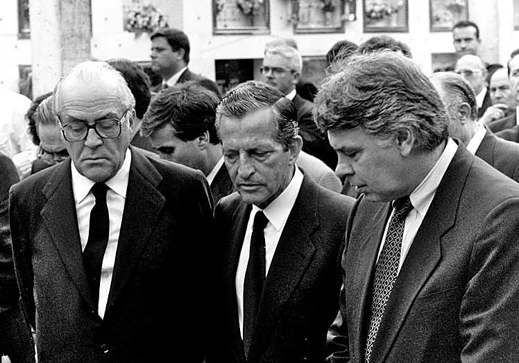 Leopoldo Calvo Sotelo, Adolfo Suárez y Felipe González acuden al cementerio de Ermua para el entierro de Miguel Ángel Blanco, asesinado por ETA en julio de 1997. «Ver a los tres presidentes de la democracia, vestidos de luto, junto al entonces príncipe Felipe, hoy Rey Felipe VI, tenía una alta carga simbólica y enmarcaba la enorme tristeza que se vivía».