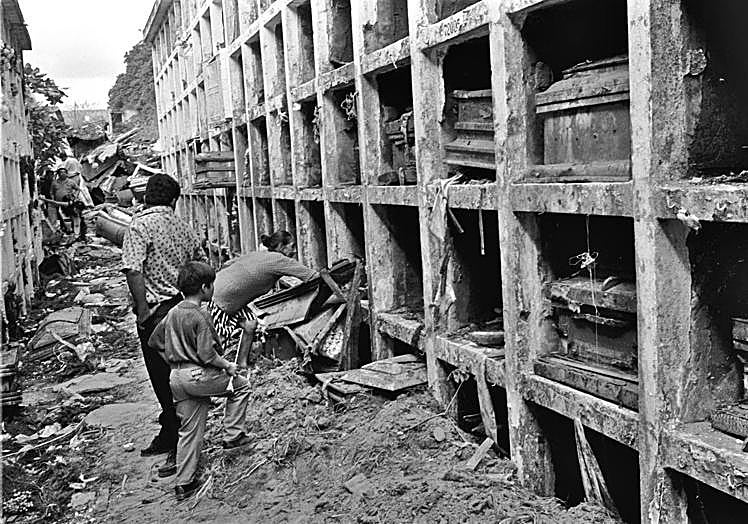 «El fenómeno climático de 'El Niño' causó en diciembre de 1997 enormes daños en Ecuador», recuerda Fidel Raso. La imagen está tomada en Guayaquil en diciembre de 1997. «La lluvia había arrastrado fuera los féretros de niños... era una imagen dantesca. Fue terrible», recuerda el fotógrafo.