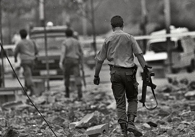 Parece un escenario de guerra pero no lo es. La foto está tomada en julio de 1989 en la casa cuartel de Llodio. ETA logró acercar por las alcantarillas un explosivo cuya explosión derribó la fachada del cuartel. En medio de unas escenas de pánico, varios guardias civiles salieron disparando al aire.