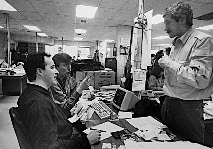 «Estamos en la redacción de Diario 16, en los 80, preparando un viaje a Francia para investigar el tema del GAL. En la imagen salimos Ricardo Arqués, Irujo y yo. Queríamos reunirnos con un etarra arrepentido, de origen francés y al que se acusaba de siete asesinatos y no lográbamos hablar con él», relata Fidel Raso.