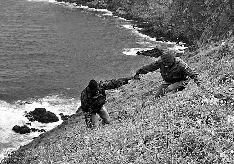 En marzo de 2011, este inmigrante llegado de Guinea Conakry huyó de la Policía sin saber que se adentraba en un acantilado del que no podía salir, en el entorno del monte Hacho, en Ceuta. «Es una de las primeras veces que dejé la cámara en la hierba. Le grité a aquel hombre que el guardia civil era buena persona, que no siguiera adelante. Al final, me creyó. Iba a lanzarse porque venía de ver uniformados que roban y matan en su viaje. Subió gateando y, sólo al final, saqué la fotografía».