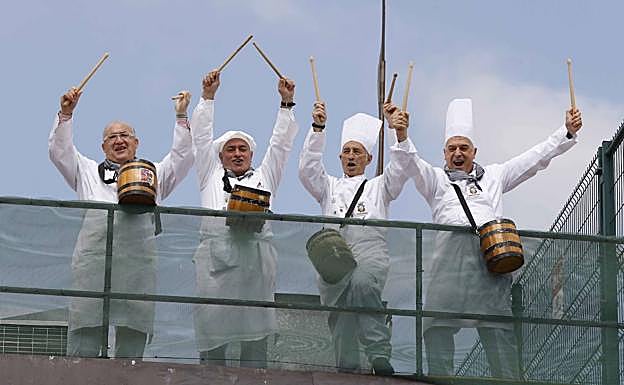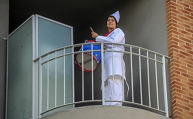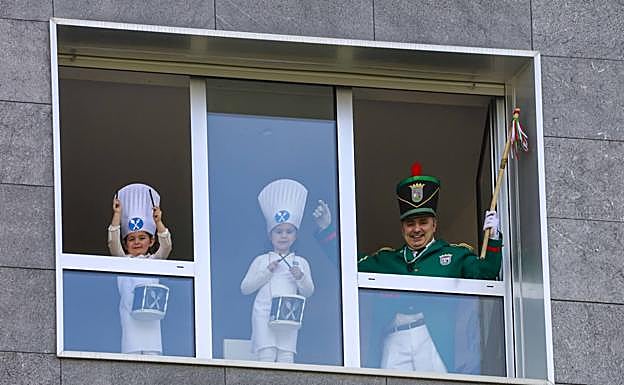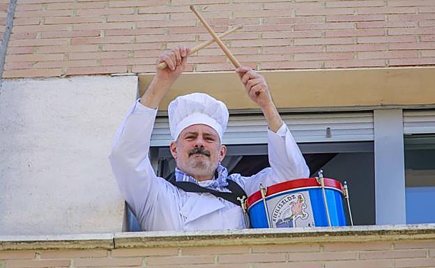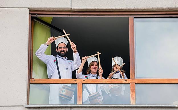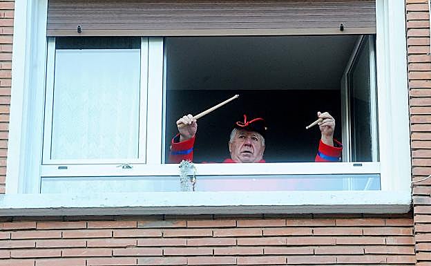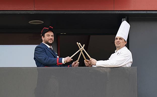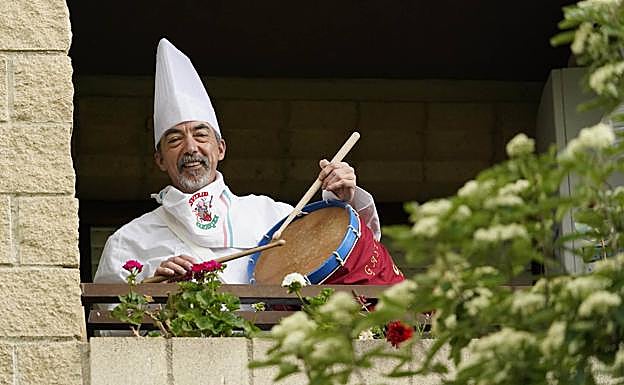 Hasta que irrumpió 'el bicho', Gotzon García Briñas tenía a su cargo toda la tropa de soldados azules y a una marabunta de cocineros que no dejaban de golpear con saña los barriles cada noche del 27 de abril. Ahora, por culpa del coronavirus, 'solo' dirige a sus pequeñas María y Sofía, de cinco y cuatro años, respectivamente, que ni cortas ni perezosas se ponen el mandil y su gorrito de minichef, toman el barrilete y asomadas a la ventana de casa se dejan llevar por los compases del aita.