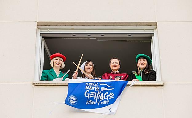 Las sociedades gastronómicas se asoman al balcón de EL CORREO para interpretar la marcha vitorianaSara López de Pariza, José Ángel Martínez Viguri y Judith Romero