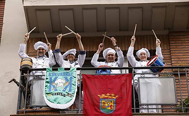 Con el estandarte de la animosa sociedad recreativo-gastronómica, más la bandera de Álava que no falte, colgando del balcón de casa. Así se presentan para la foto, de lo más festivos, los de Kukubarre, un txoko que se incorporó a la tamborrada vitoriana cuando ya estaba en marcha y que no piensa salirse del desfile jamás, aunque el virus le haya puesto un obstáculo en el camino.Se esquivará.