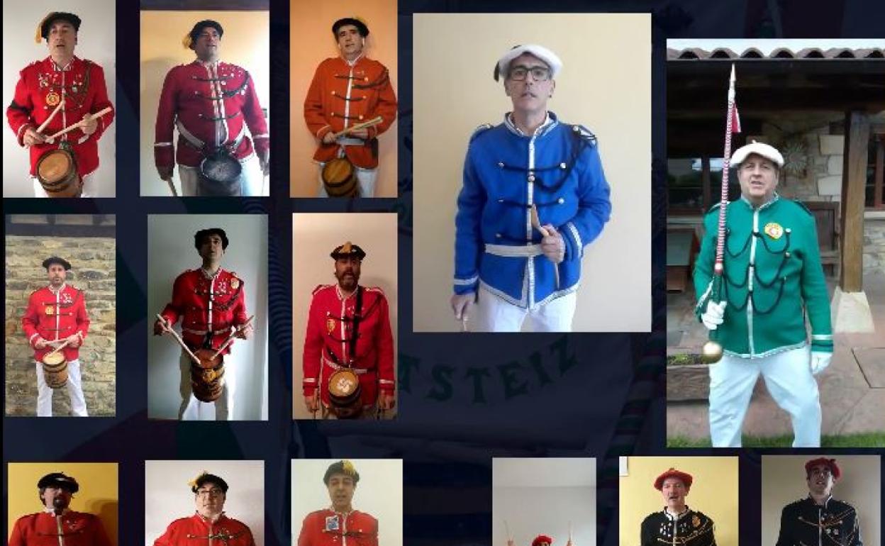 Recluidos, sí, cada uno en su domicilio, algunos en Ali, pero inquietos y festivos. Los de Okerrak no han perdido la oportunidad de dejar su impronta en un San Prudencio confinado y sin fiestas. «Este año nos quedamos en casa.... Pero no sin tocar», dice el lema que han estampado en su creación musical. Como en otras ocasiones se han liado la manta a la cabeza y creado un vídeo tan casero como bien logrado con la grabación de una tamborrada divertida y también nostálgica.Cuarenta miembros de la cuadrilla de blusas, de las sociedades gastronómicas Eskola Zaharra y Kakiturri, amigos y las tres majorettes que desfilan con los estandartes cada noche del 27 de abril se han vestido para la ocasión y milagrosamente han acompasado sus toques, redobles y movimientos hasta obtener una pequeña obra de arte digital.