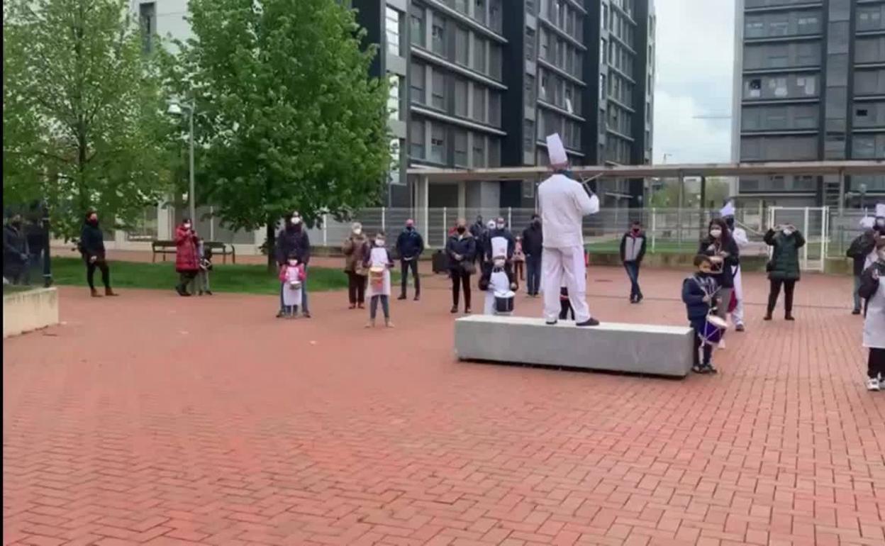 «Esta va por ti, Iván», podía leerse en las sábanas colgadas de los balcones en las calles Bulevar de Mariturri y Clara Campoamor, ... en el barrio de Zabalgana. Vecinos de este distrito se unieron este martes para tocar la retreta hasta en tres ocasiones -a las seis, a las siete y a las ocho de la tarde- para homenajear a Iván Usubiaga, fallecido en octubre a los 44 años y que el año pasado se convirtió en el 'alma de la fiesta' para propios y extraños en el día de San Prudencio y en aquellas jornadas tan duras del confinamiento total. Hasta 60 personas tocaron en la calle y otras decenas les acompañaron desde las ventanas de sus casas. «Queríamos tomar el testigo de Iván, estaría orgulloso de nosotros», explica Ana Isabel Bravo, miembro de la Banda Municipal y profesora de la escuela de música Luis Aramburu.