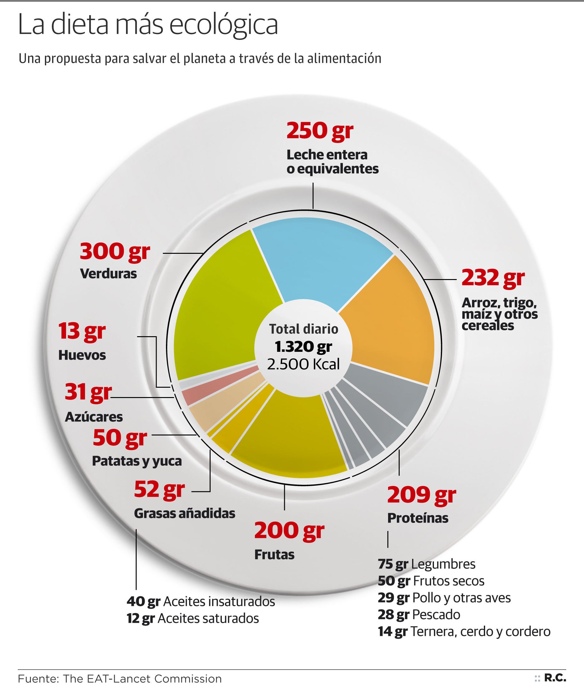 Una comisión de expertos internacionales ha elaborado un modelo de dieta que pretende conseguir dos objetivos muy importantes. El primero de ellos, reducir las emisiones de CO2 a la atmósfera. El segundo, hacer disminuir las tasas de obesidad. La dieta que han establecido por persona y día contiene un total de 2.500 kilocalorías, lo que equivale a 1.324 gramos de alimentos. Esta nueva forma de alimentación contendría: 200 gramos de frutas, 250 gramos de leche entera o equivalente de productos lácteos, 232 gramos de arroz, trigo, maíz y otros cereales, 300 gramos de verduras, 31 gramos de azúcares, 52 gramos de grasas añadidas (de los que 40 gramos serán aceites insaturados y 12 de saturados), 50 gramos de patatas y yuca, 13 gramos de huevos y 209 gramos de proteínas (75 gramos de legumbres, 50 gramos de frutos secos, 29 gramos de pollo y otras aves, 28 gramos de pescado y el resto de ternera, cordero y cerdo).