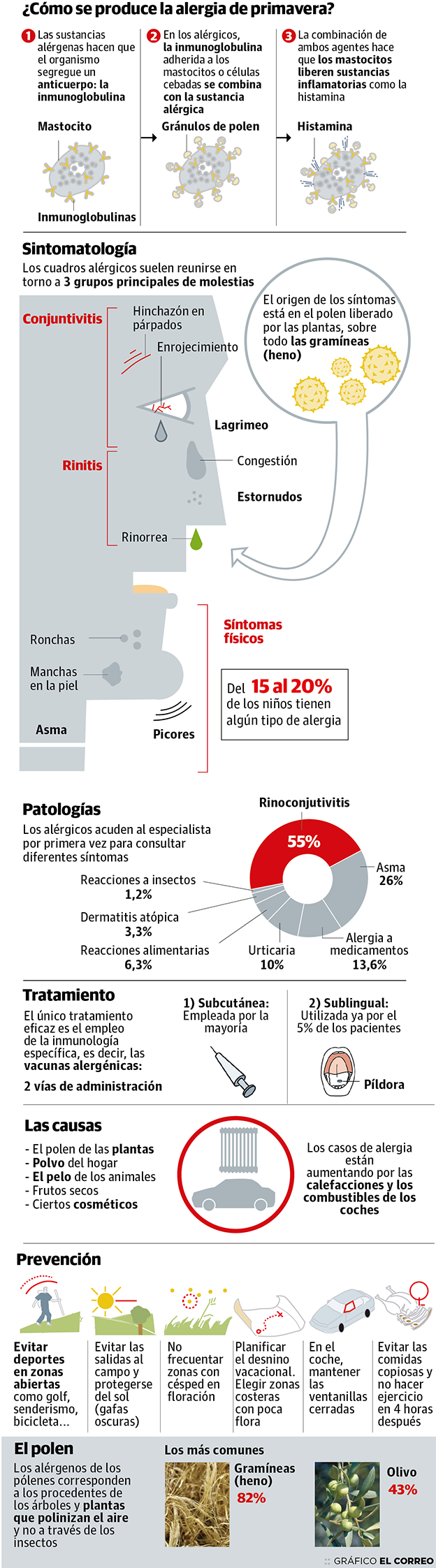 Salir de casa pañuelo en mano, lagrimeo, congestión y nariz chorreando en pleno febrero se antoja la imagen típica de un catarro causado por el ... frío. Aunque no coincide plenamente con la que se ha generalizado este año en Euskadi. Muchos de los 400.000 vascos alérgicos al polen de las gramíneas se vieron sorprendidos antes de tiempo y han pasado su peor invierno en el último cuatro de siglo. Al menos, parece que lo peor ha pasado y les espera una primavera llevadera. Esa es la previsión de la Sociedad Española de Alergología e Inmonulogía Clínica (SEAIC): la intensidad de afección de este polvillo procedente de árboles y plantas que inunda el ambiente y hace posible la floración será «leve» en la comunidad autónoma y el conjunto de la cornisa cantábrica.